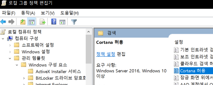 시작메뉴 - >gpedit.msc 입력 -> 컴퓨터구성 -> 관리 템플릿 -> Windows 구성요소