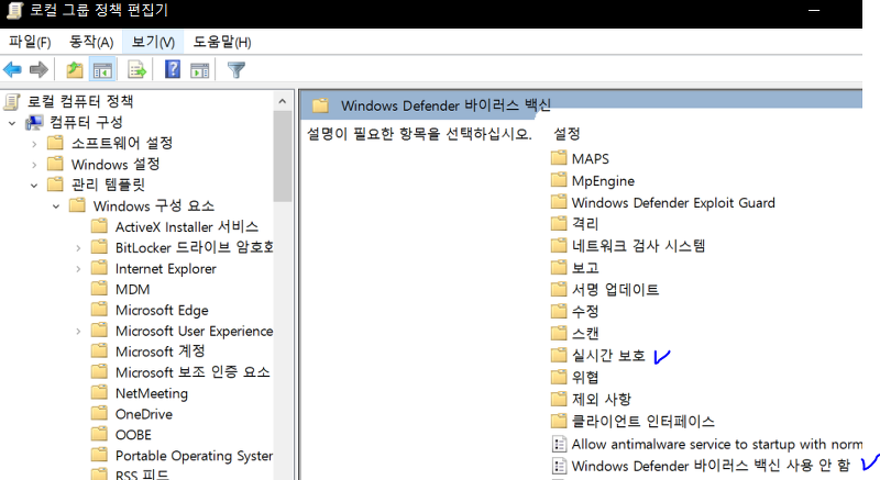 -> Windows Defender 바이러스 백신 -> Windows Defender 바이러스 백신 사용 안함(더블클릭) -> 사용 체크 후 확인